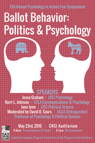 Psychology in Action is proud to announce our fifth annual interdisciplinary symposium, Monday, May 23rd, 2016, from 4 to 6pm in UCLA’s CNSI Auditorium. The discussion will focus on factors that influence voters’ beliefs and behavior. Th …